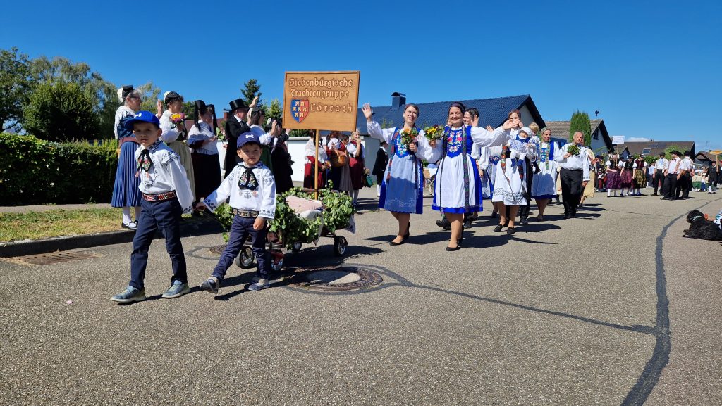 Auch unsere Kreisgruppe Lörrach Siebenbürger Sachsen präsentierte sich mit einer Gruppe Trachtenträger mit strahlenden Gesichtern bei strahlendem Sonnenschein. Zusammen mit anderen Trachtengruppen sorgte unsere Tanzgruppe mit Darbietungen verschiedener Tänze für ausgelassen Stimmung.